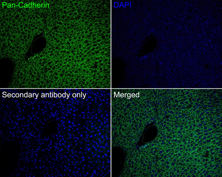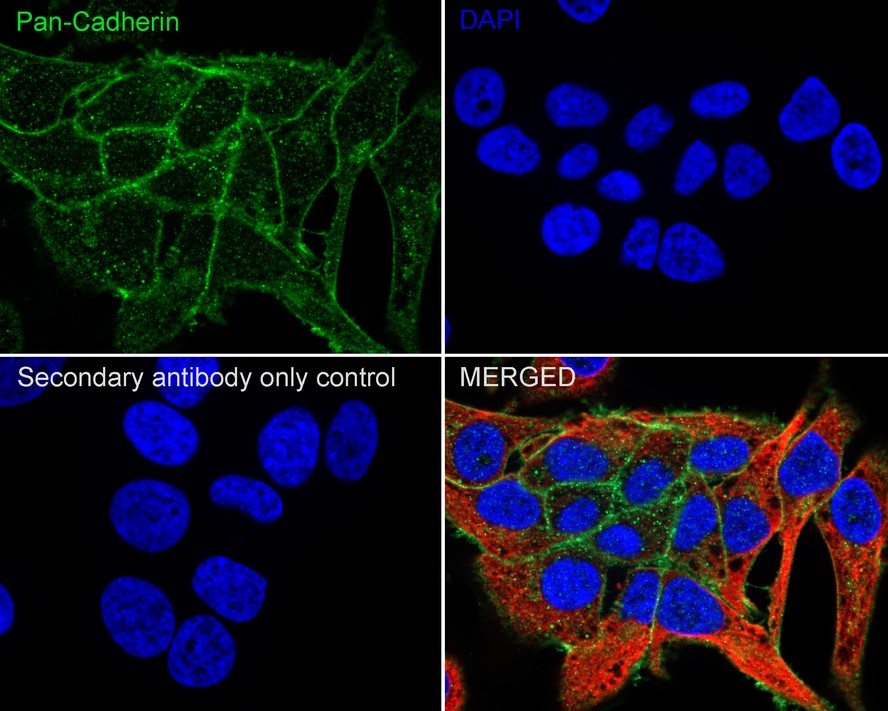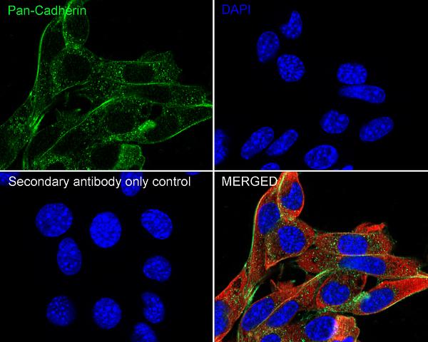 Cells were fixed in 4% paraformaldehyde for 20 minutes at room temperature, permeabilized with 0.1% Triton X-100 in PBS for 5 minutes at room temperature, then blocked with 1% BSA in 10% negative goat serum for 1 hour at room temperature. Cells were then incubated with Rabbit anti-Pan-Cadherin antibody (HA750190) at 1/100 dilution in 1% BSA in PBST overnight at 4 ℃. Goat Anti-Rabbit IgG H&L (iFluor™ 488, HA1121) was used as the secondary antibody at 1/1,000 dilution. PBS instead of the primary antibody was used as the secondary antibody only control. Nuclear DNA was labelled in blue with DAPI.