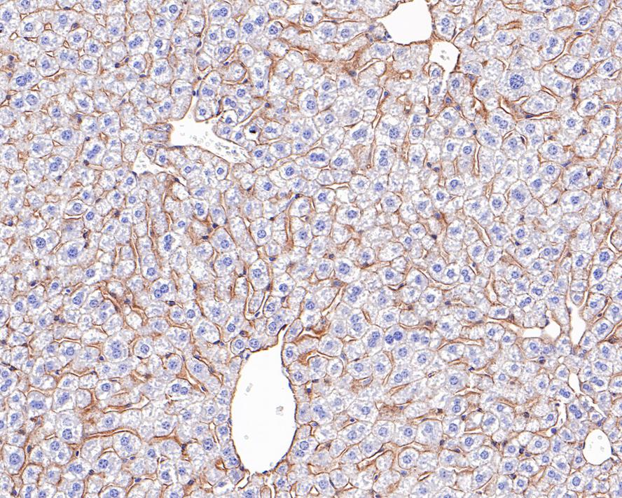 Immunohistochemical analysis of paraffin-embedded mouse liver tissue with Rabbit anti-Pan-Cadherin antibody (HA750190) at 1/1,000 dilution.