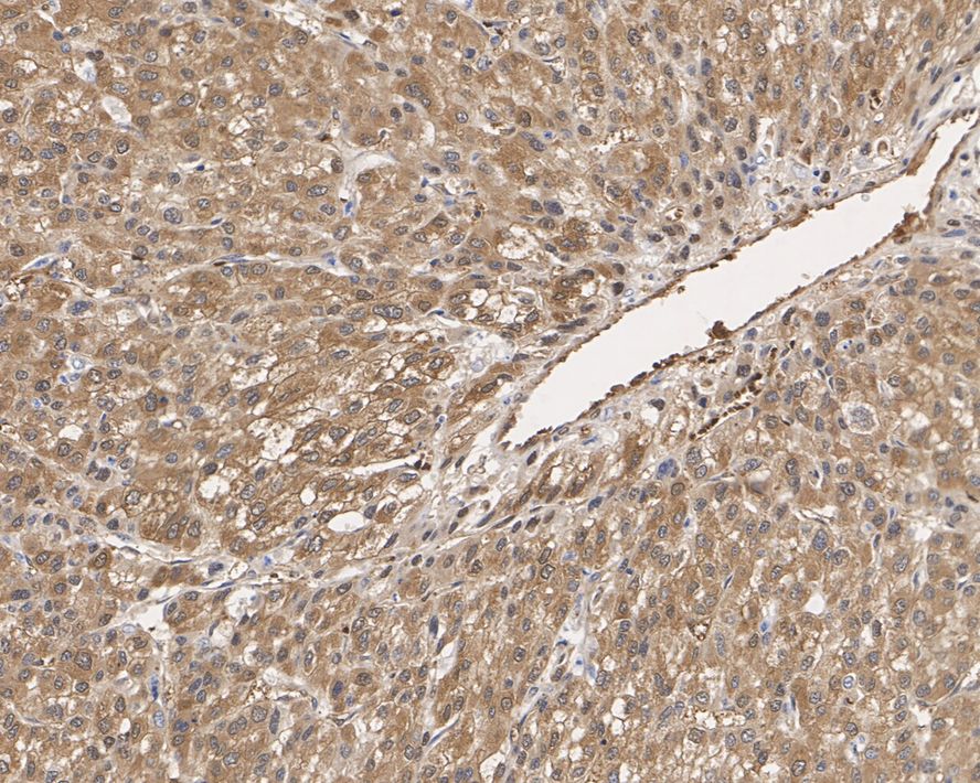 Immunohistochemical analysis of paraffin-embedded human liver carcinoma tissue with Mouse anti-Peroxiredoxin 2 antibody (EM1701-72) at 1/1,000 dilution.
