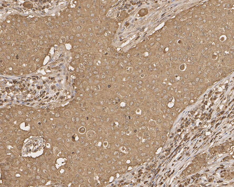 The section was pre-treated using heat mediated antigen retrieval with Tris-EDTA buffer (pH 9.0) for 20 minutes. The tissues were blocked in 1% BSA for 20 minutes at room temperature, washed with ddH2O and PBS, and then probed with the primary antibody (EM1701-72) at 1/200 dilution for 1 hour at room temperature. The detection was performed using an HRP conjugated compact polymer system. DAB was used as the chromogen. Tissues were counterstained with hematoxylin and mounted with DPX.