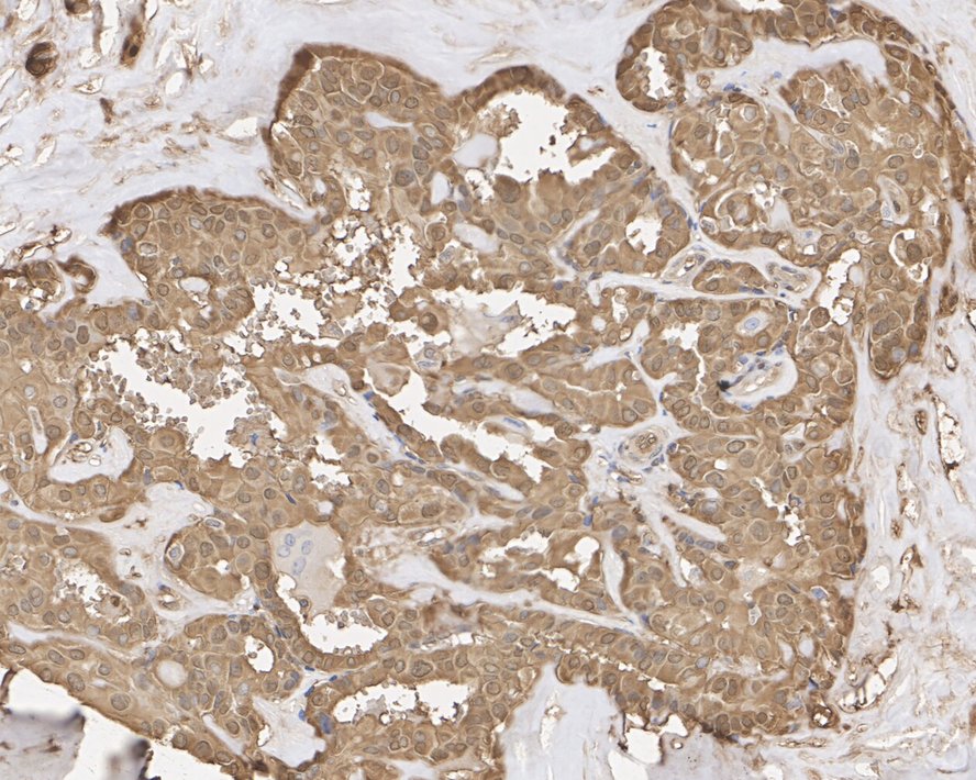 Immunohistochemical analysis of paraffin-embedded human thyroid carcinoma tissue with Mouse anti-Peroxiredoxin 2 antibody (EM1701-72) at 1/1,000 dilution.