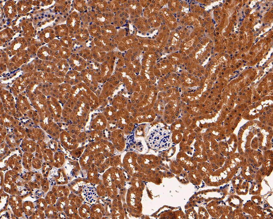 Immunohistochemical analysis of paraffin-embedded mouse kidney tissue with Mouse anti-Peroxiredoxin 2 antibody (EM1701-72) at 1/200 dilution.