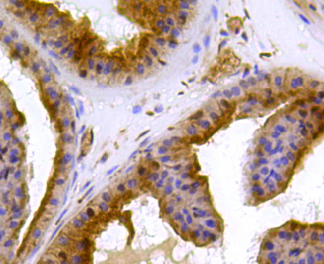 Immunohistochemical analysis of paraffin-embedded mouse prostate tissue using anti-Peroxiredoxin 2/PRDX2 antibody. Counter stained with hematoxylin.