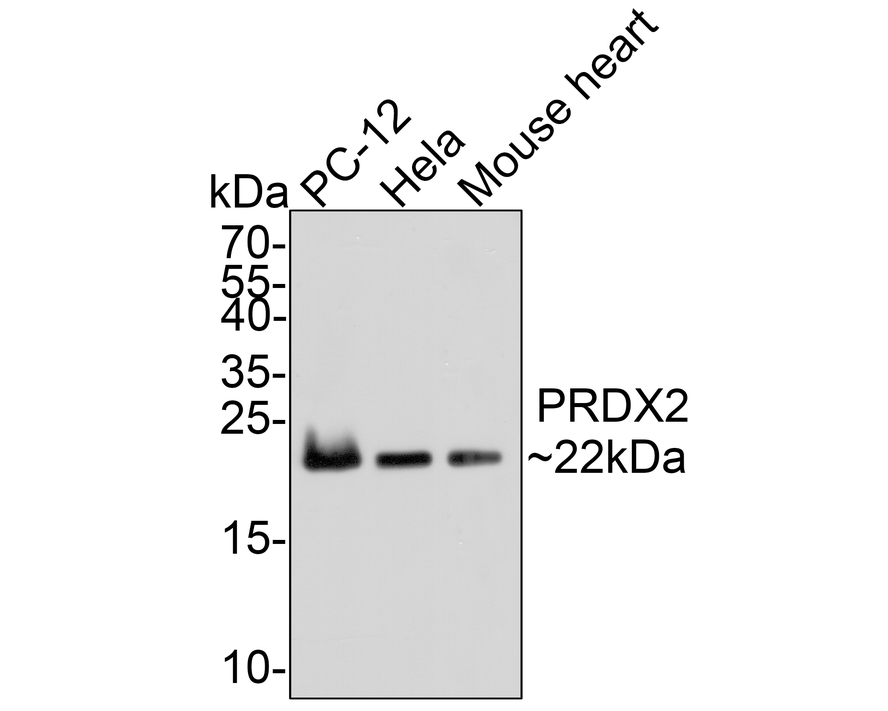 Western blot analysis of Peroxiredoxin 2 on different lysates with Rabbit anti-Peroxiredoxin 2 antibody (R1510-37) at 1/5,000 dilution.