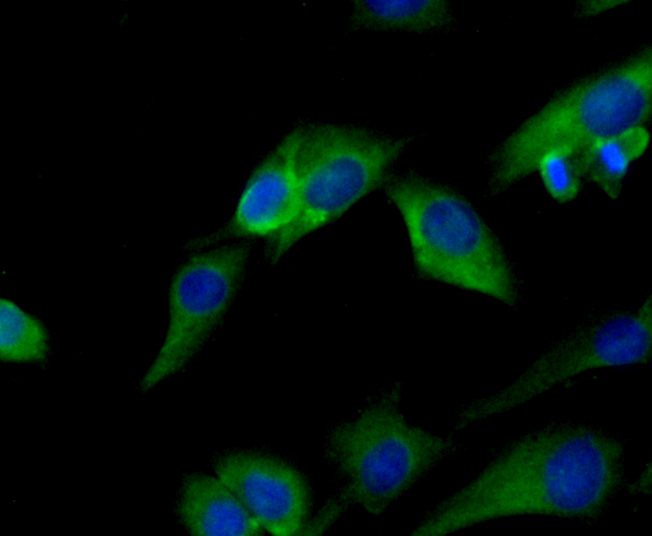 ICC staining Peroxiredoxin 2/PRDX2 in SHG-44 cells (green). The nuclear counter stain is DAPI (blue). Cells were fixed in paraformaldehyde, permeabilised with 0.25% Triton X100/PBS.