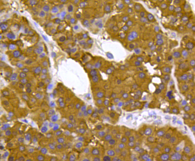 Immunohistochemical analysis of paraffin-embedded human liver tissue using anti-Peroxiredoxin 2/PRDX2 antibody. Counter stained with hematoxylin.