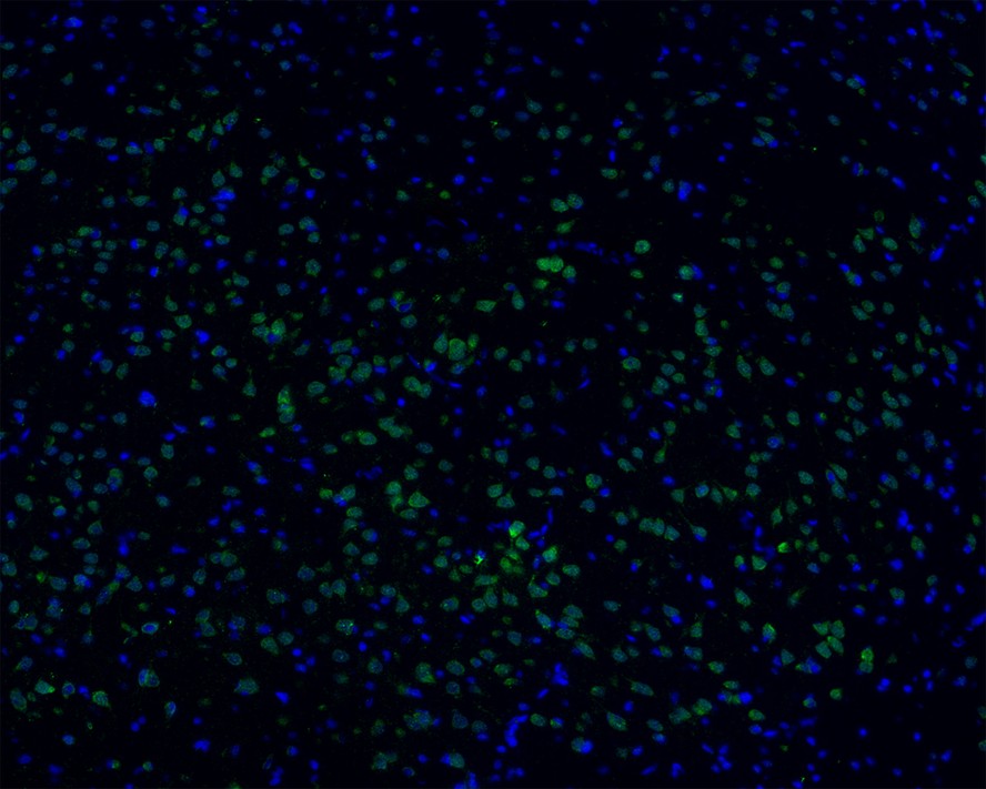 Cells were fixed in 4% paraformaldehyde for 20 minutes at room temperature, permeabilized with 0.1% Triton X-100 in PBS for 5 minutes at room temperature, then blocked with 1% BSA in 10% negative goat serum for 1 hour at room temperature. Cells were then incubated with Rabbit anti-Phospho-AKT (S473) antibody (HA750132) at 1/1,000 dilution in 1% BSA in PBST overnight at 4 ℃. Goat Anti-Rabbit IgG H&L (iFluor™ 488, HA1121) was used as the secondary antibody at 1/1,000 dilution. PBS instead of the primary antibody was used as the secondary antibody only control. Nuclear DNA was labelled in blue with DAPI.
