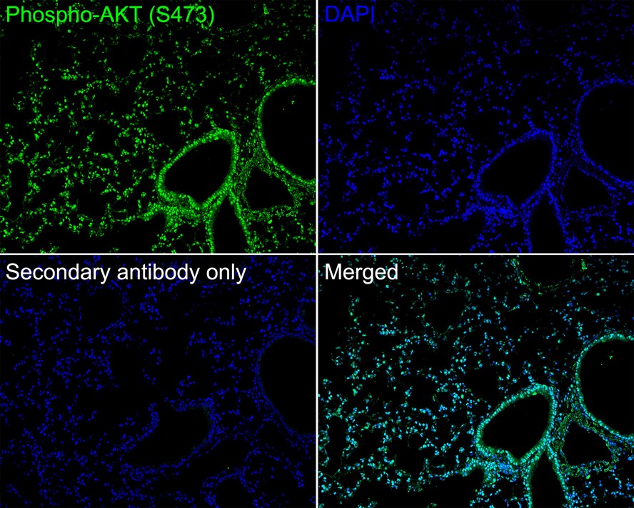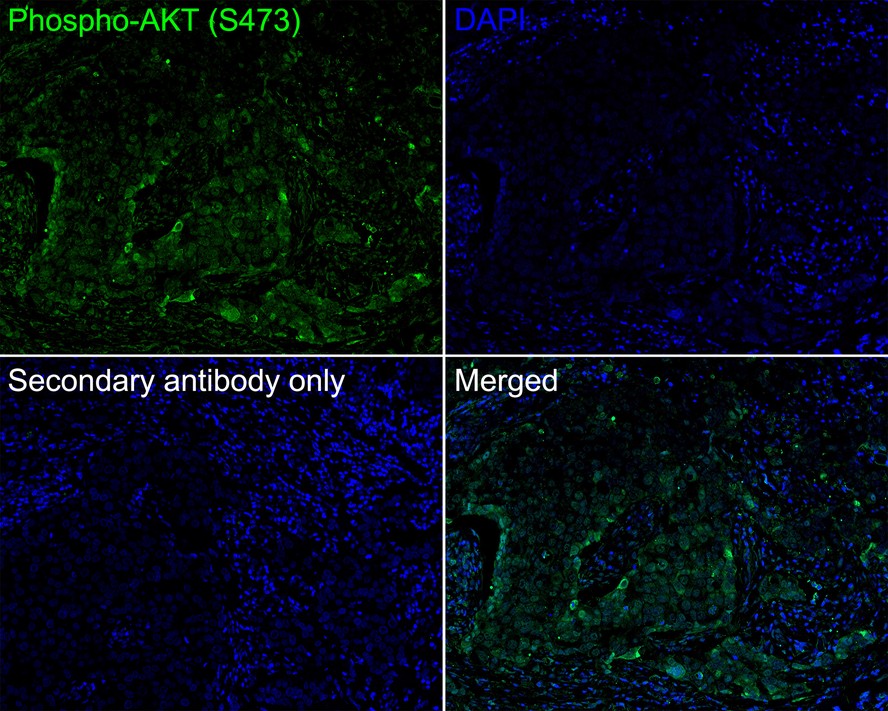 Cells were fixed in 4% paraformaldehyde for 20 minutes at room temperature, permeabilized with 0.1% Triton X-100 in PBS for 5 minutes at room temperature, then blocked with 1% BSA in 10% negative goat serum for 1 hour at room temperature. Cells were then incubated with Rabbit anti-Phospho-AKT (S473) antibody (HA750132) at 1/200 dilution in 1% BSA in PBST overnight at 4 ℃. Goat Anti-Rabbit IgG H&L (iFluor™ 488, HA1121) was used as the secondary antibody at 1/1,000 dilution. PBS instead of the primary antibody was used as the secondary antibody only control. Nuclear DNA was labelled in blue with DAPI.