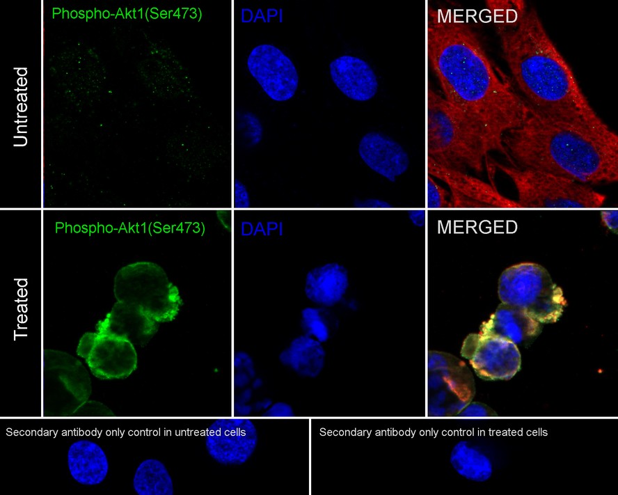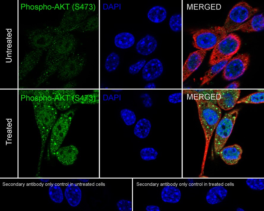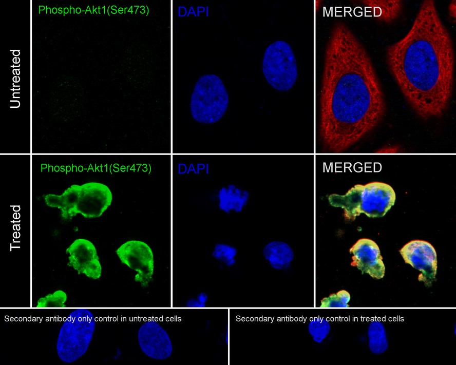 Cells were fixed in 4% paraformaldehyde for 20 minutes at room temperature, permeabilized with 0.1% Triton X-100 in PBS for 5 minutes at room temperature, then blocked with 1% BSA in 10% negative goat serum for 1 hour at room temperature. Cells were then incubated with Rabbit anti-Phospho-AKT (S473) antibody (HA750132) at 1/100 dilution in 1% BSA in PBST overnight at 4 ℃. Goat Anti-Rabbit IgG H&L (iFluor™ 488, HA1121) was used as the secondary antibody at 1/1,000 dilution. PBS instead of the primary antibody was used as the secondary antibody only control. Nuclear DNA was labelled in blue with DAPI.
