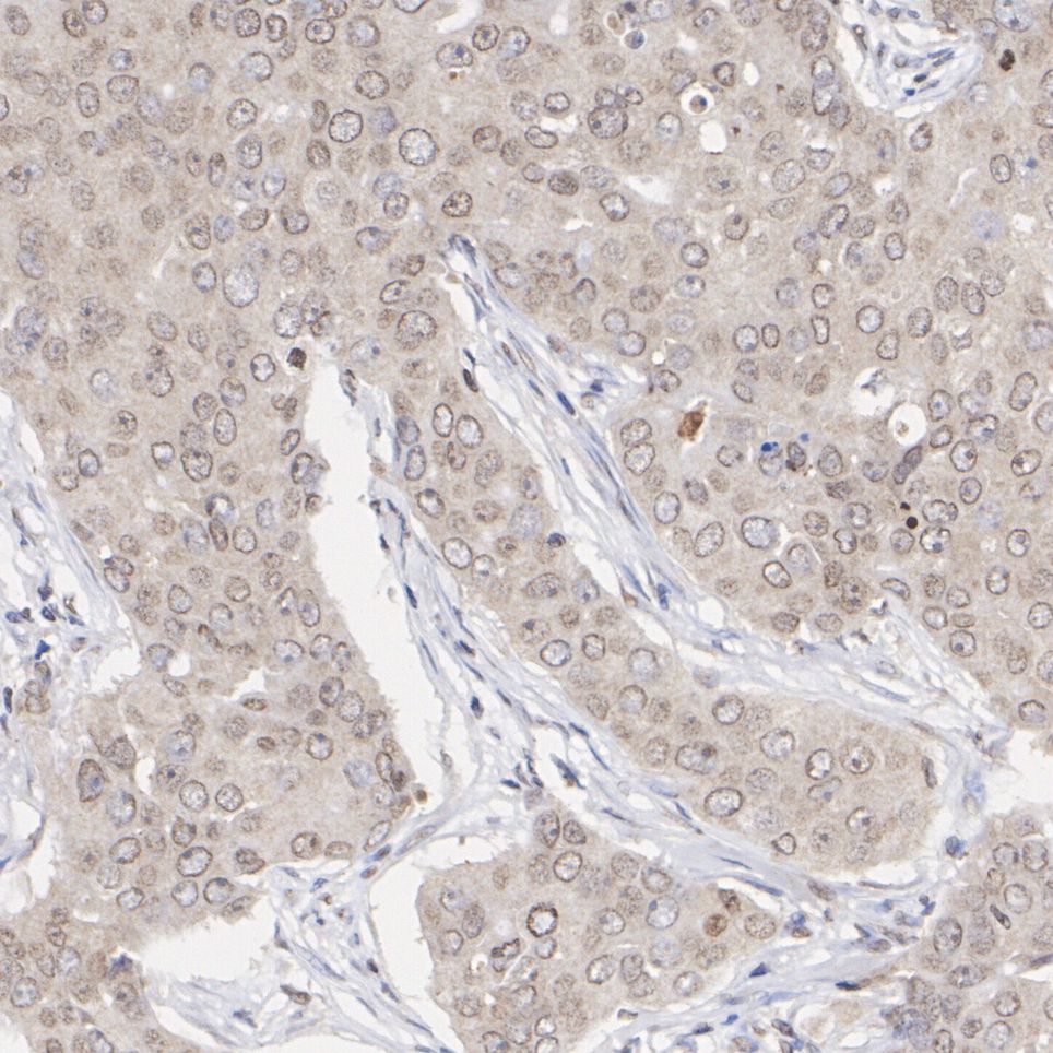 The section was pre-treated using heat mediated antigen retrieval with sodium citrate buffer (pH 6.0) (high pressure) for 2 minutes. The tissues were blocked in 1% BSA for 20 minutes at room temperature, washed with ddH2O and PBS, and then probed with the primary antibody (HA750953) at 1/200 dilution for 1 hour at room temperature. The detection was performed using an HRP conjugated compact polymer system. DAB was used as the chromogen. Tissues were counterstained with hematoxylin and mounted with DPX.