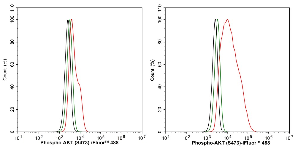 Flow cytometric analysis of NIH/3T3 cells untreated (left) / treated with 100ng/mL PDGF for 1 hour (right) labeling Phospho-AKT (S473).