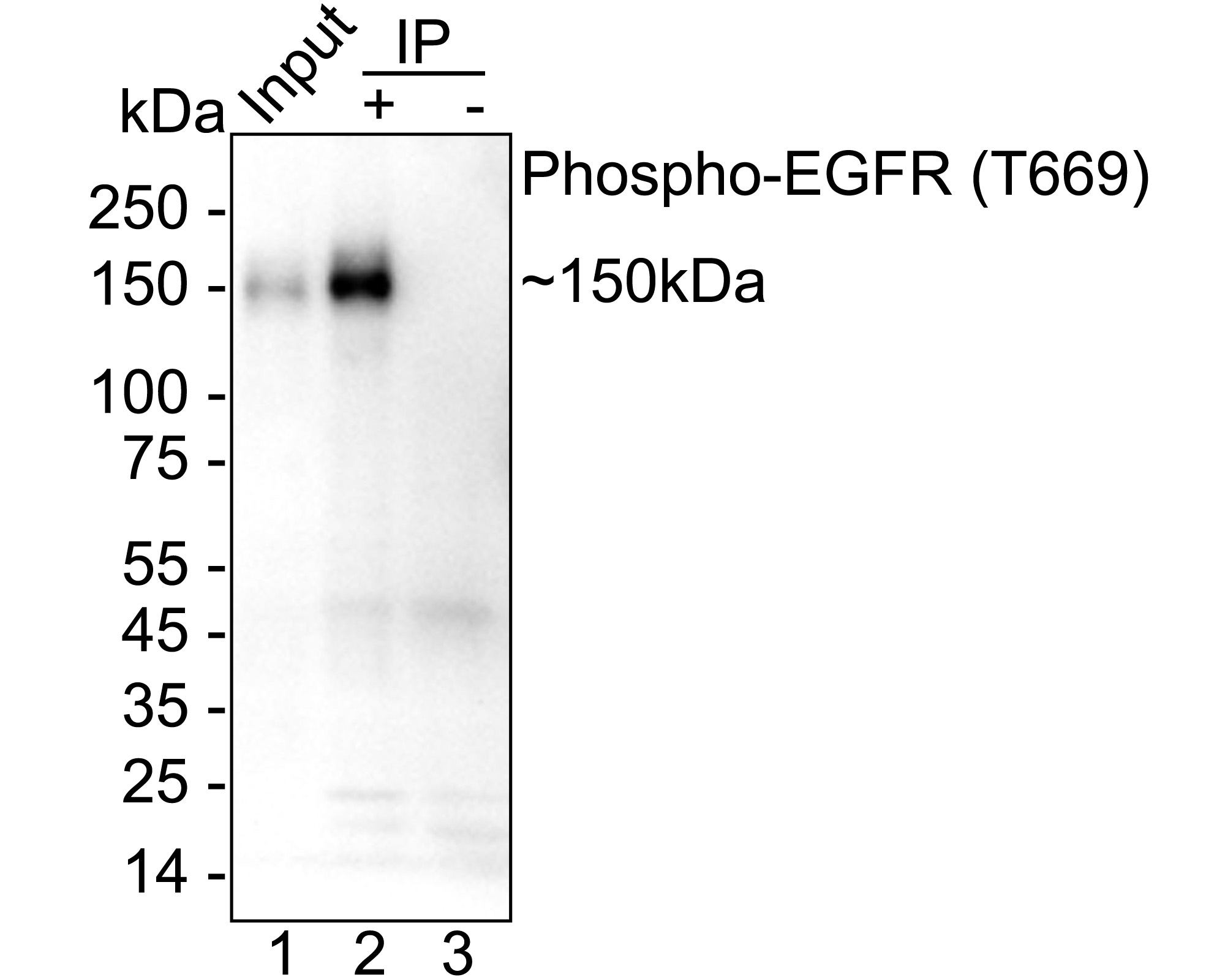 Phospho-EGFR (T669) was immunoprecipitated from 0.2 mg A431 starved overnight then treated with 100ng/mL EGF for 15 minutes cell lysate with HA751333 at 2 µg/10 µl beads. Western blot was performed from the immunoprecipitate using HA751333 at 1/2,000 dilution. HRP Conjugated Anti-Rabbit IgG for IP Nano-secondary antibody at 1/5,000 dilution was used for 1 hour at room temperature.
