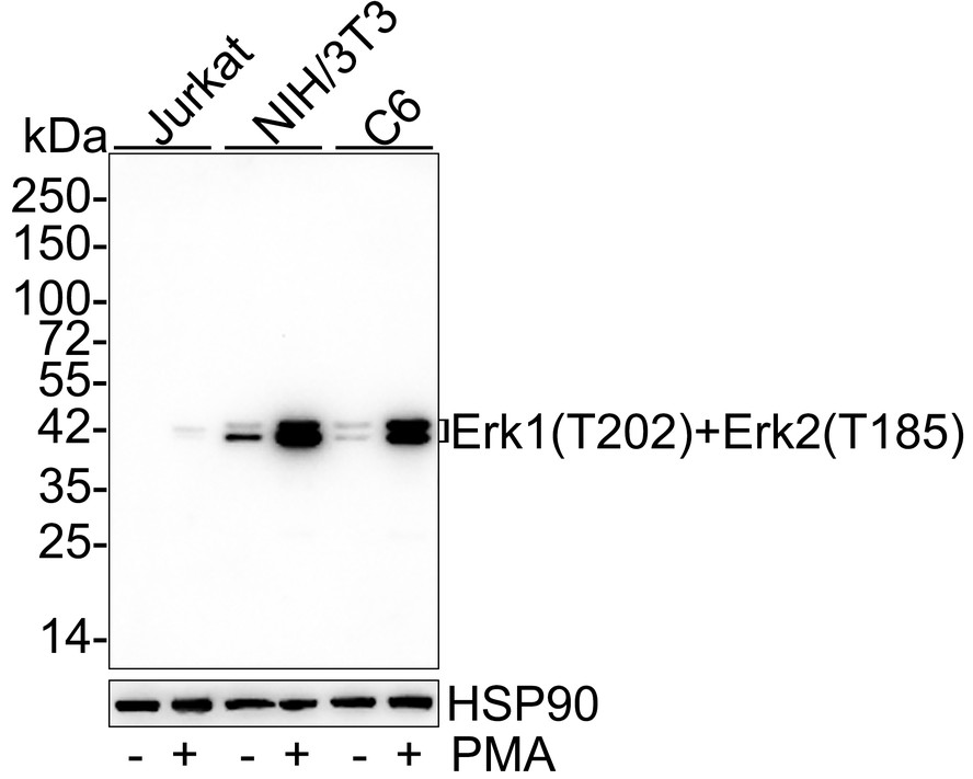 Jurkat treated with 200ng/mL PMA for 35 minutes cell lysate, NIH/3T3 cell lysate, NIH/3T3 treated with 200nM PMA for 30 minutes cell lysate, C6 cell lysate, C6 treated with 200nM PMA for 30 minutes cell lysate, A549, NIH/3T3, MCF-7, human lung carcinoma tissue, human kidney tissue, human gallbladder tissue.