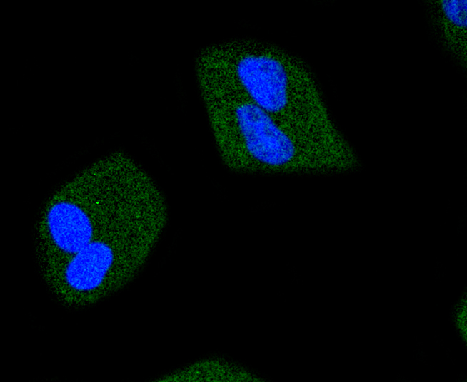 ICC staining of Phospho-JAK2 (Y1007 + Y1008) in Hela cells (green). Formalin fixed cells were permeabilized with 0.1% Triton X-100 in TBS for 10 minutes at room temperature and blocked with 1% Blocker BSA for 15 minutes at room temperature. Cells were probed with the primary antibody (HA750117, 1/50) for 1 hour at room temperature, washed with PBS. Alexa Fluor®488 Goat anti-Rabbit IgG was used as the secondary antibody at 1/1,000 dilution. The nuclear counter stain is DAPI (blue).