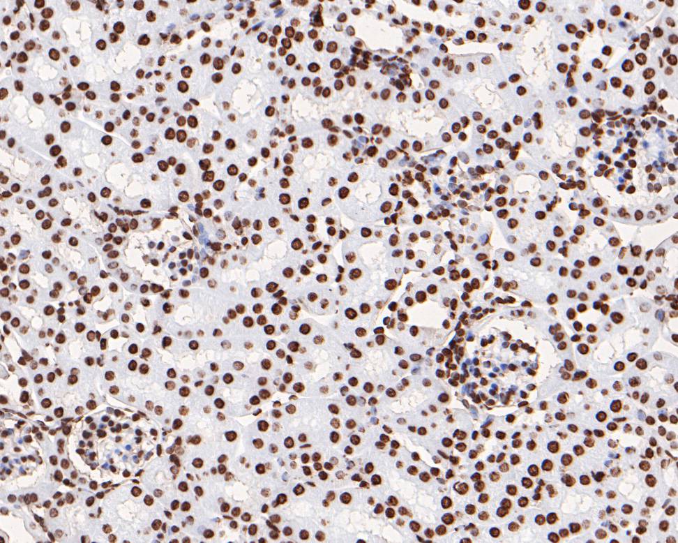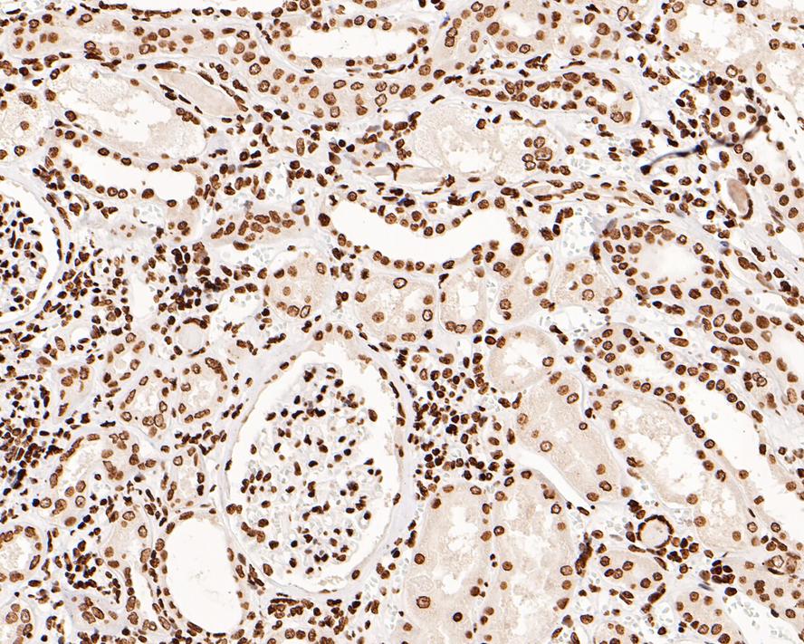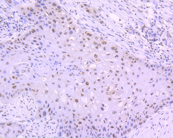 The section was pre-treated using heat mediated antigen retrieval with sodium citrate buffer (pH 6.0) (high pressure) for 2 minutes. The tissues were blocked in 1% BSA for 20 minutes at room temperature, washed with ddH2O and PBS, and then probed with the primary antibody (HA750117) at 1/500 dilution for 1 hour at room temperature. The detection was performed using an HRP conjugated compact polymer system. DAB was used as the chromogen. Tissues were counterstained with hematoxylin and mounted with DPX.
