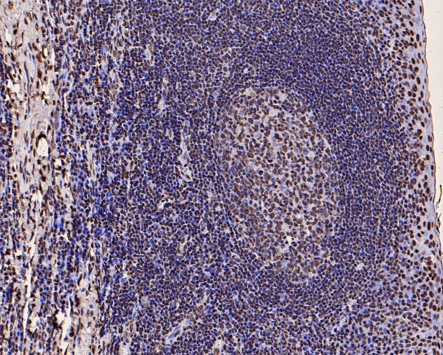 Immunohistochemical analysis of paraffin-embedded human tonsil tissue with Rabbit anti-Phospho-JAK2 (Y1007 + Y1008) antibody (HA750117) at 1/500 dilution.