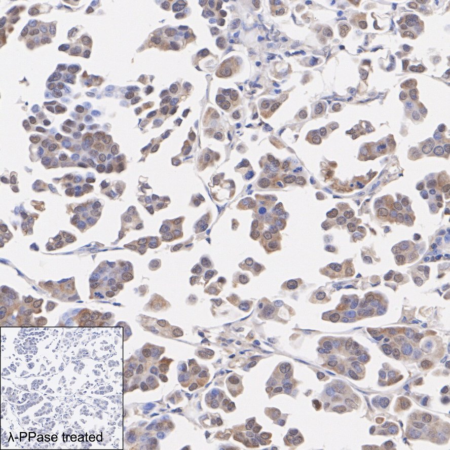 Immunohistochemical analysis of paraffin-embedded human breast cancer tissue untreated / treated with λpp with Rabbit anti-Phospho-PKC alpha/beta II (T638/T641) antibody (HA751595) at 1/200 dilution.