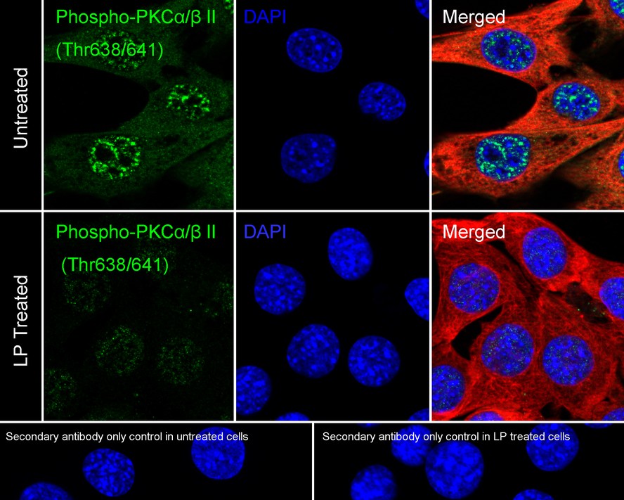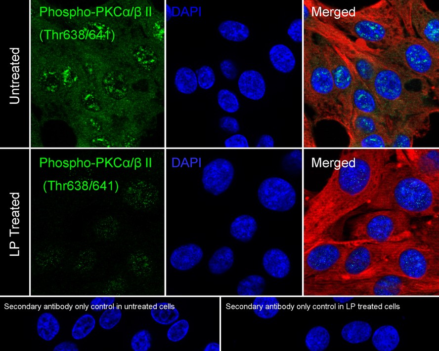 Cells were fixed in 4% paraformaldehyde for 15 minutes at room temperature, permeabilized with 0.1% Triton X-100 in PBS for 15 minutes at room temperature, then blocked with 1% BSA in 10% negative goat serum for 1 hour at room temperature. Cells were then incubated with Rabbit anti-Phospho-PKC alpha/beta II (T638/T641) antibody (HA751595) at 1/100 dilution in 1% BSA in PBST overnight at 4 ℃. Goat Anti-Rabbit IgG H&L (iFluor™ 488, HA1121) was used as the secondary antibody at 1/1,000 dilution. PBS instead of the primary antibody was used as the secondary antibody only control. Nuclear DNA was labelled in blue with DAPI.