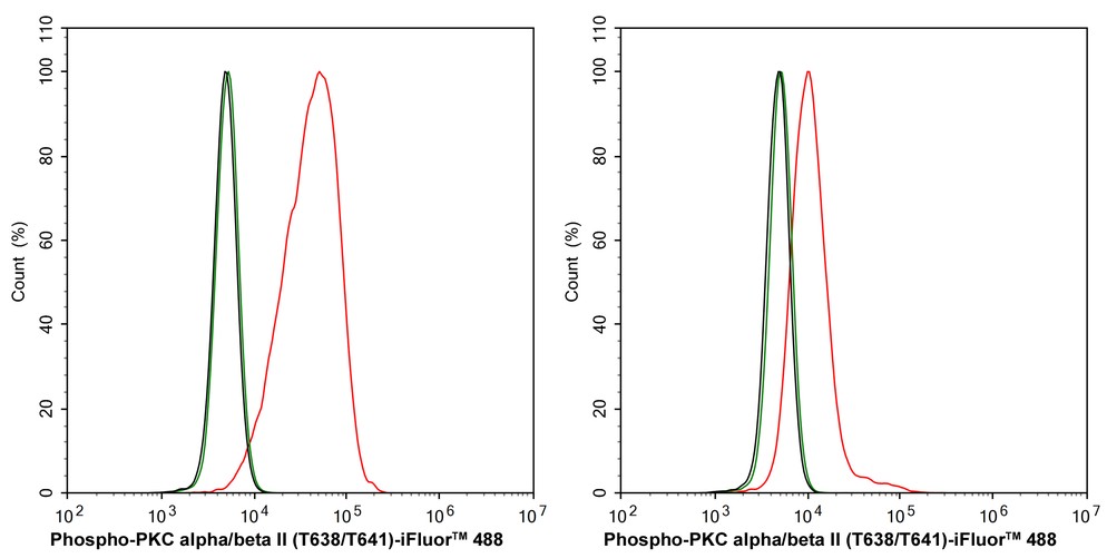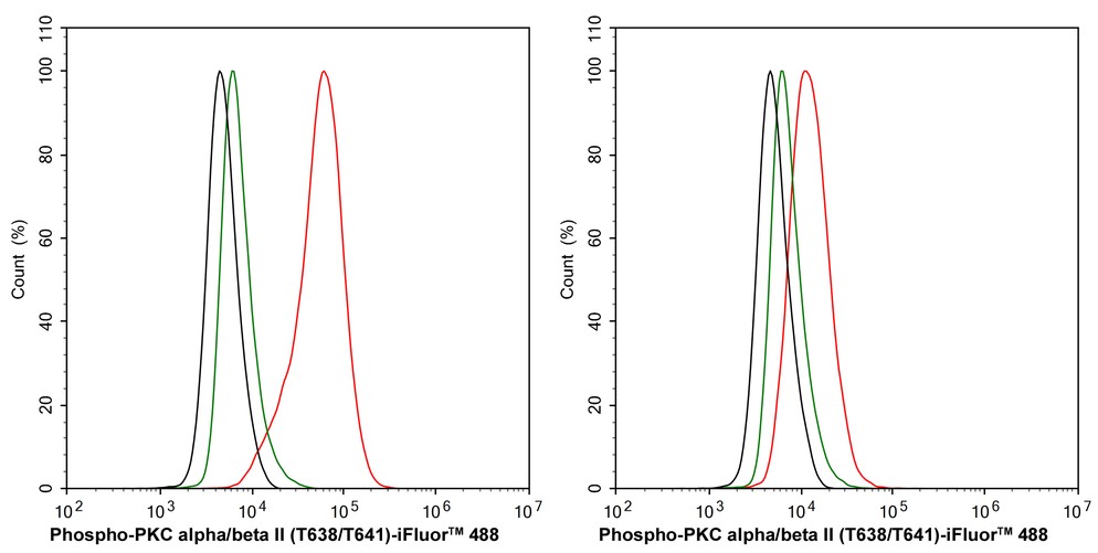 Flow cytometric analysis of NIH/3T3 cells untreated (left) / treated with λpp (right) labeling Phospho-PKC alpha/beta II (T638/T641).