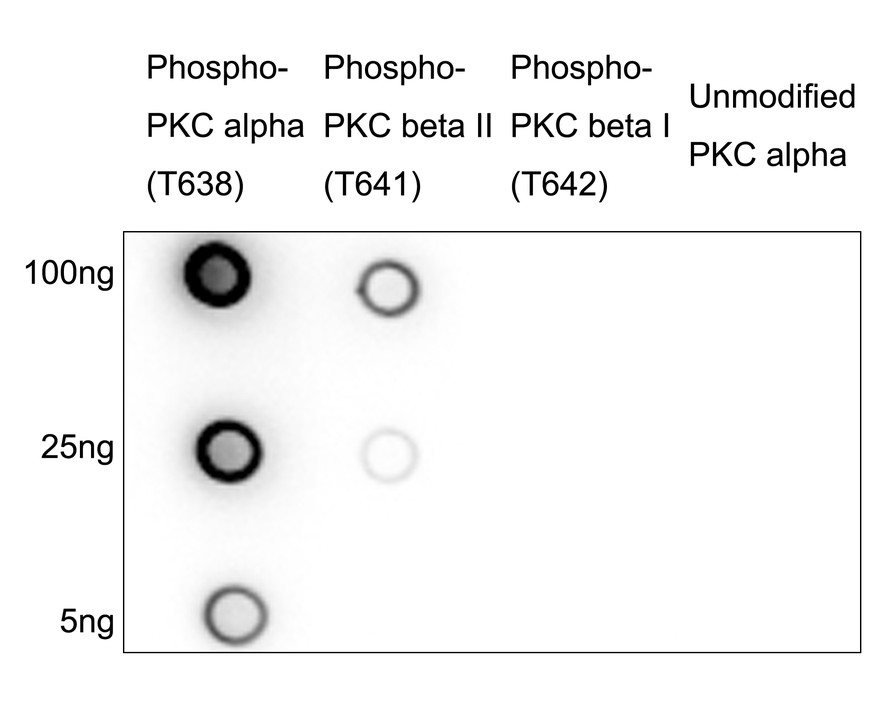 Dot blot analysis of Phospho-PKC alpha/beta II (T638/T641) on different peptides with Rabbit anti-Phospho-PKC alpha/beta II (T638/T641) antibody (HA751595) at 1/5,000 dilution. Goat Anti-Rabbit IgG - HRP Secondary Antibody (HA1001) at 1/50,000 dilution for 1 hour at room temperature.