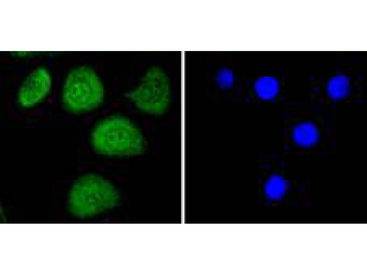 ICC staining of Phospho-c-Myc (T58) in Hela cells (green). Formalin fixed cells were permeabilized with 0.1% Triton X-100 in TBS for 10 minutes at room temperature and blocked with 1% Blocker BSA for 15 minutes at room temperature. Cells were probed with the primary antibody (ET1611-24, 1/50) for 1 hour at room temperature, washed with PBS. Alexa Fluor®488 Goat anti-Rabbit IgG was used as the secondary antibody at 1/1,000 dilution. The nuclear counter stain is DAPI (blue).