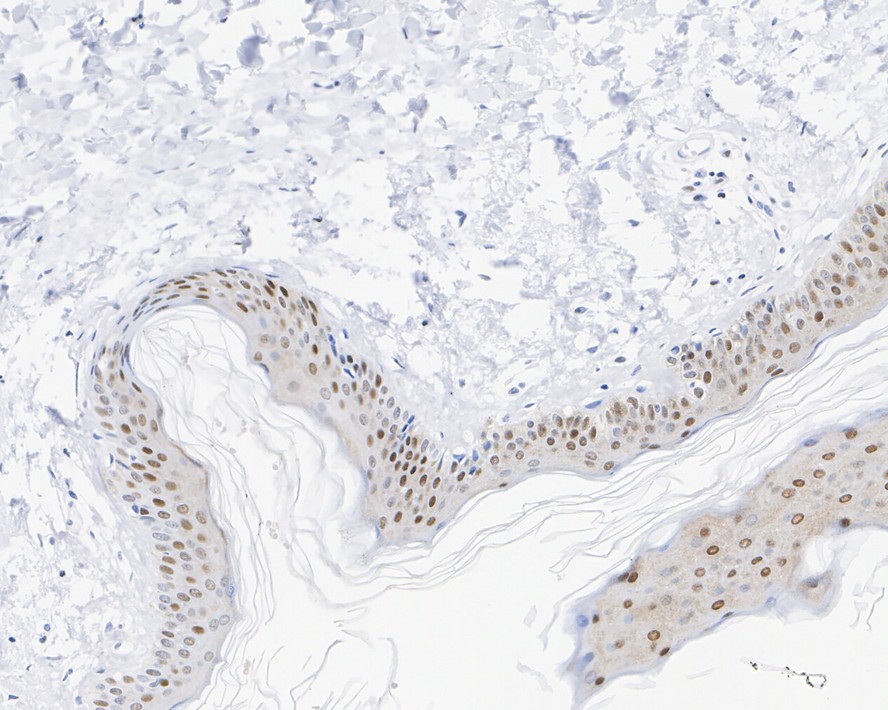 Immunohistochemical analysis of paraffin-embedded human skin tissue with Rabbit anti-Phospho-c-Myc (T58) antibody (ET1611-24) at 1/500 dilution.