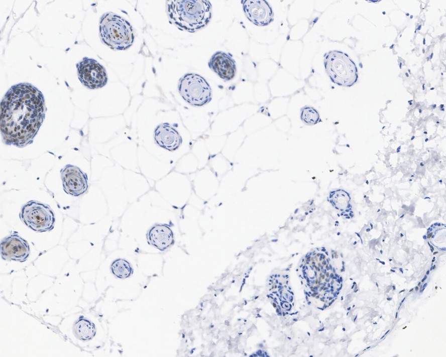 Immunohistochemical analysis of paraffin-embedded mouse skin tissue with Rabbit anti-Phospho-c-Myc (T58) antibody (ET1611-24) at 1/500 dilution.