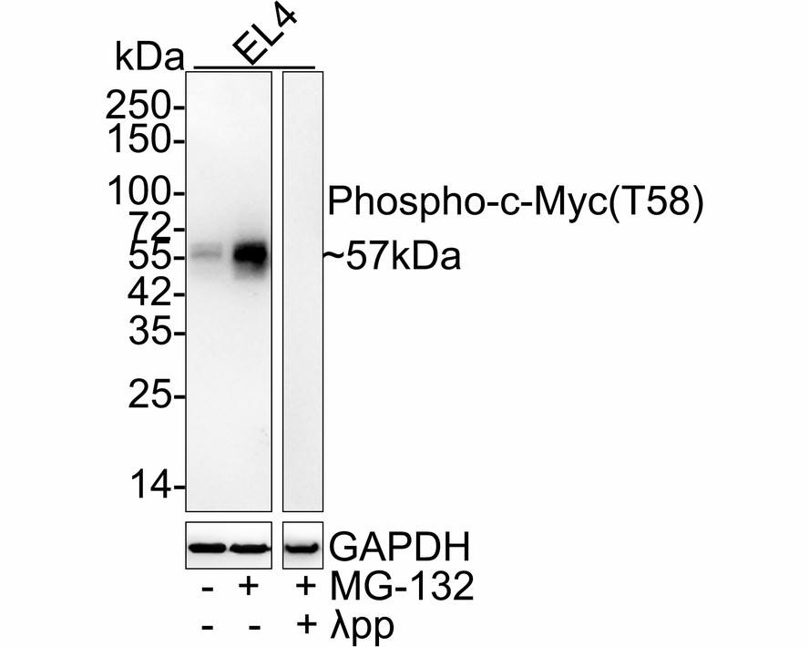 Western blot analysis of Phospho-c-Myc (T58) on different lysates with Rabbit anti-Phospho-c-Myc (T58) antibody (ET1611-24) at 1/1,000 dilution.