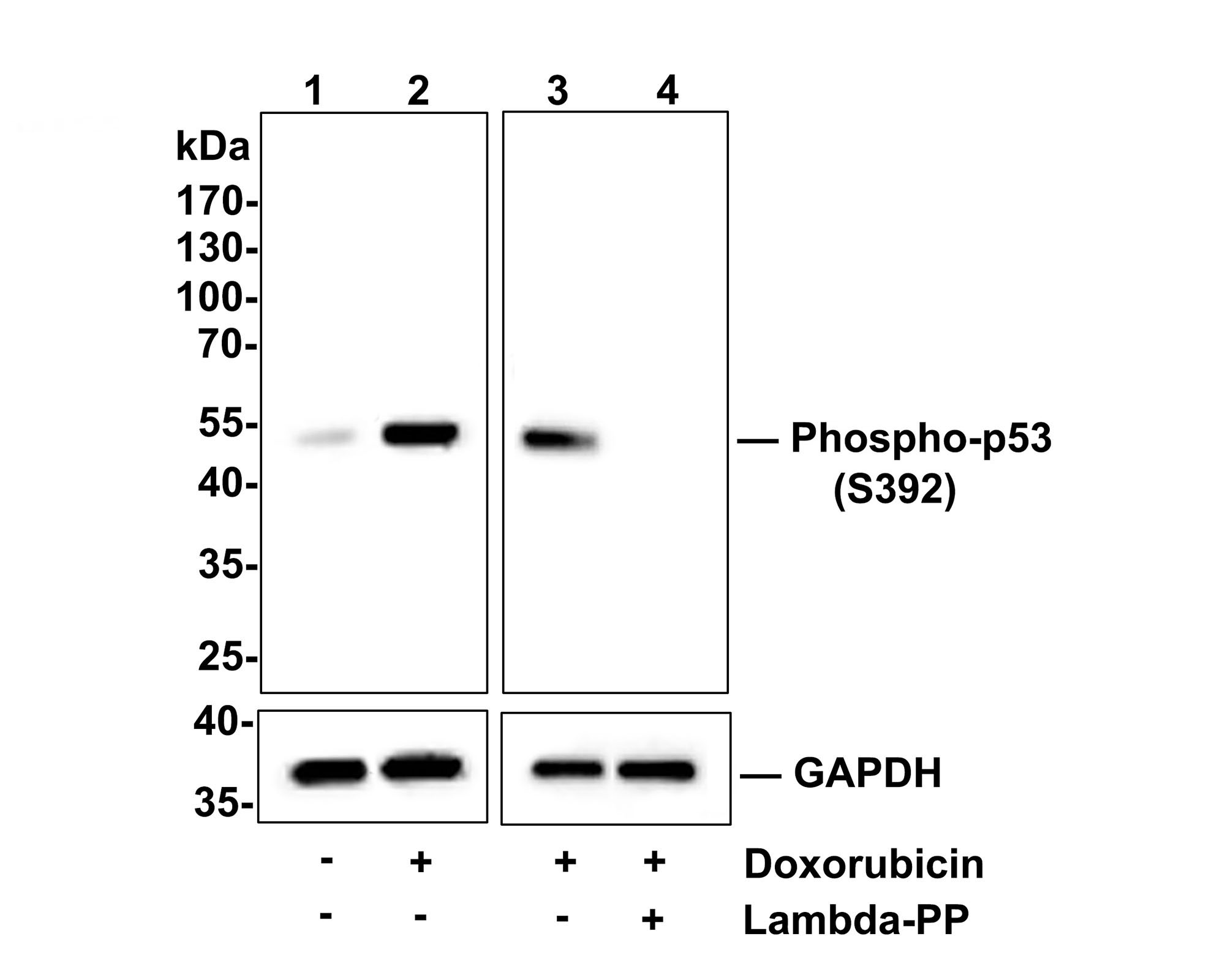 Lane 4: A549 cells treated with 250nM Doxorubicin overnight, then treated with 2.8ug/ul lambda-PP for 30 minutes, whole cell lysates, 10ug/lane