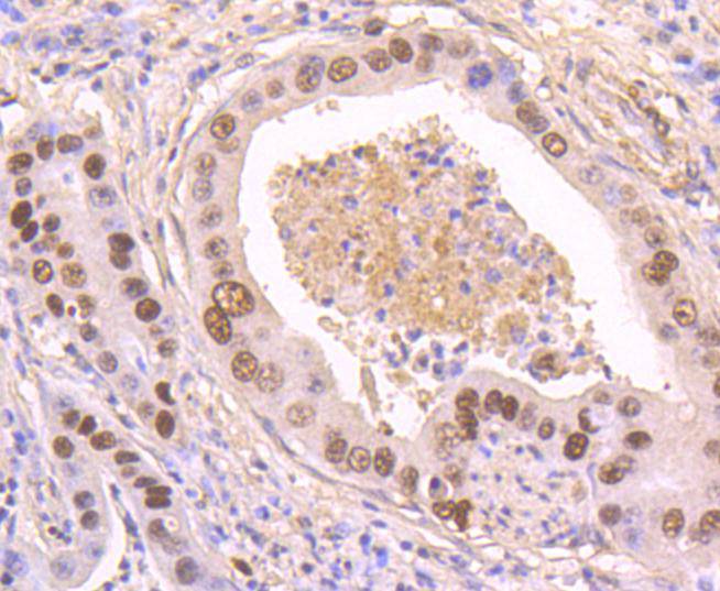 Immunohistochemical analysis of paraffin-embedded human stomach carcinoma tissue using anti-Phospho-p53 (S392) antibody. The section was pre-treated using heat mediated antigen retrieval with Tris-EDTA buffer (pH 8.0-8.4) for 20 minutes.The tissues were blocked in 5% BSA for 30 minutes at room temperature, washed with ddH2O and PBS, and then probed with the primary antibody (HA750097, 1/50) for 30 minutes at room temperature. The detection was performed using an HRP conjugated compact polymer system. DAB was used as the chromogen. Tissues were counterstained with hematoxylin and mounted with DPX.