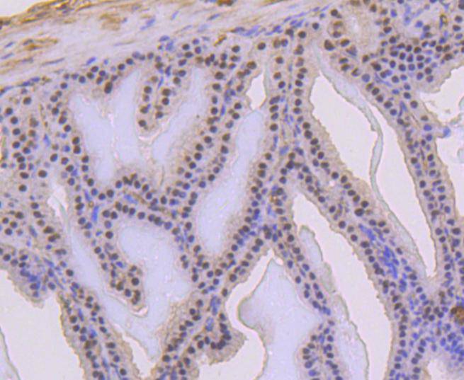 Immunohistochemical analysis of paraffin-embedded mouse prostate tissue using anti-Phospho-p53 (S392) antibody. The section was pre-treated using heat mediated antigen retrieval with Tris-EDTA buffer (pH 8.0-8.4) for 20 minutes.The tissues were blocked in 5% BSA for 30 minutes at room temperature, washed with ddH2O and PBS, and then probed with the primary antibody (HA750097, 1/50) for 30 minutes at room temperature. The detection was performed using an HRP conjugated compact polymer system. DAB was used as the chromogen. Tissues were counterstained with hematoxylin and mounted with DPX.