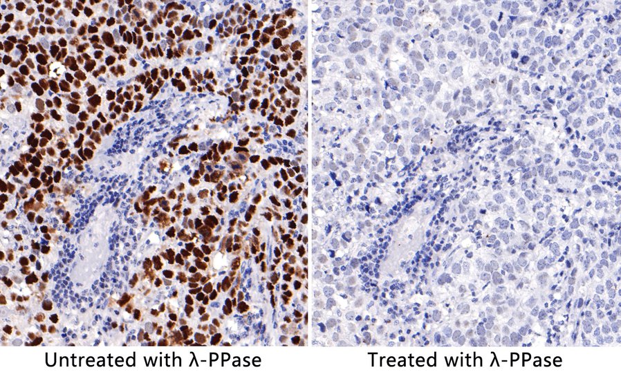 Immunohistochemical analysis of paraffin-embedded Human gastric adenocarcinoma tissue untreaed and treated with λ-PPase with Rabbit anti-Phospho-p53 (S392) antibody (HA750097) at 1/200 dilution.