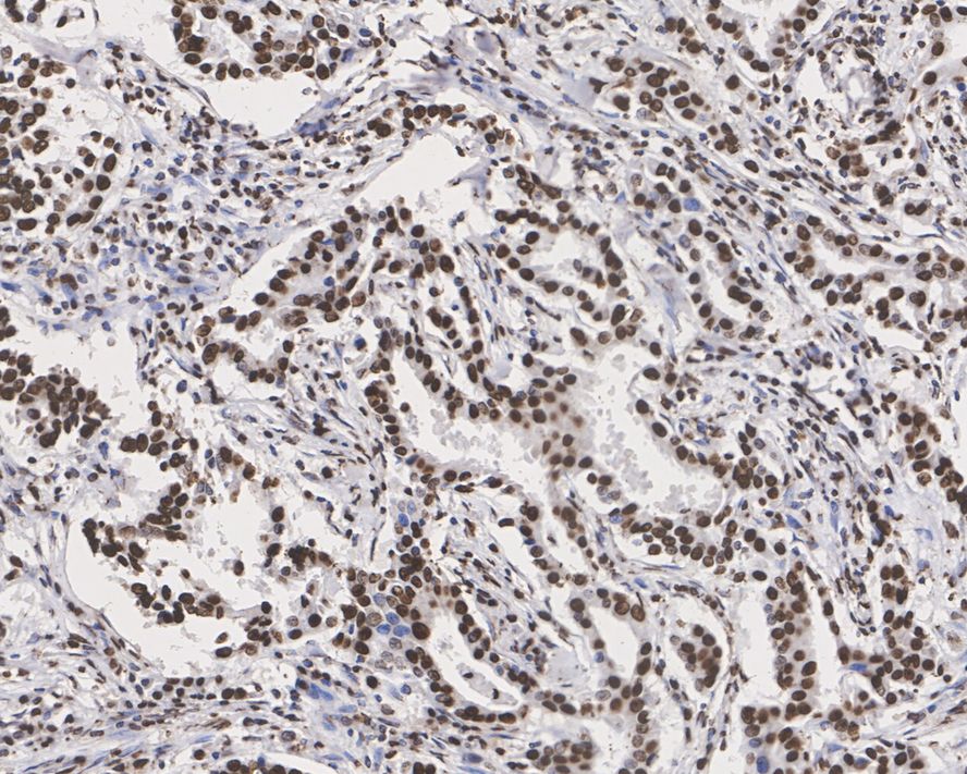 Immunohistochemical analysis of paraffin-embedded human breast carcinoma tissue with Rabbit anti-Phospho-p70 S6 Kinase (T389) antibody (HA750791) at 1/1,000 dilution.