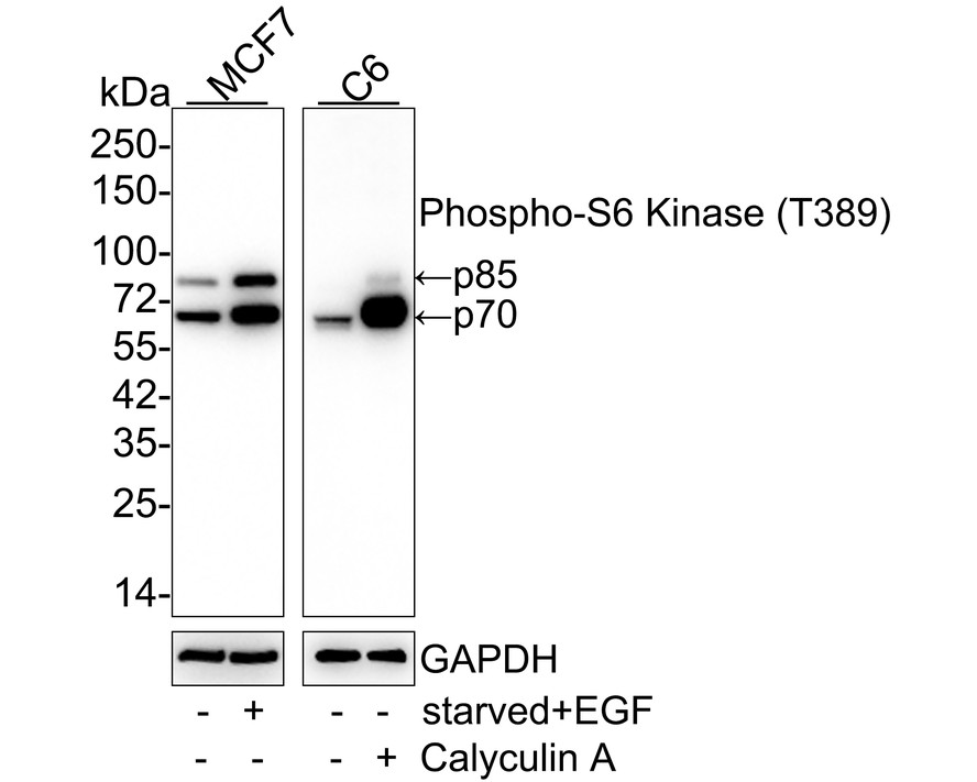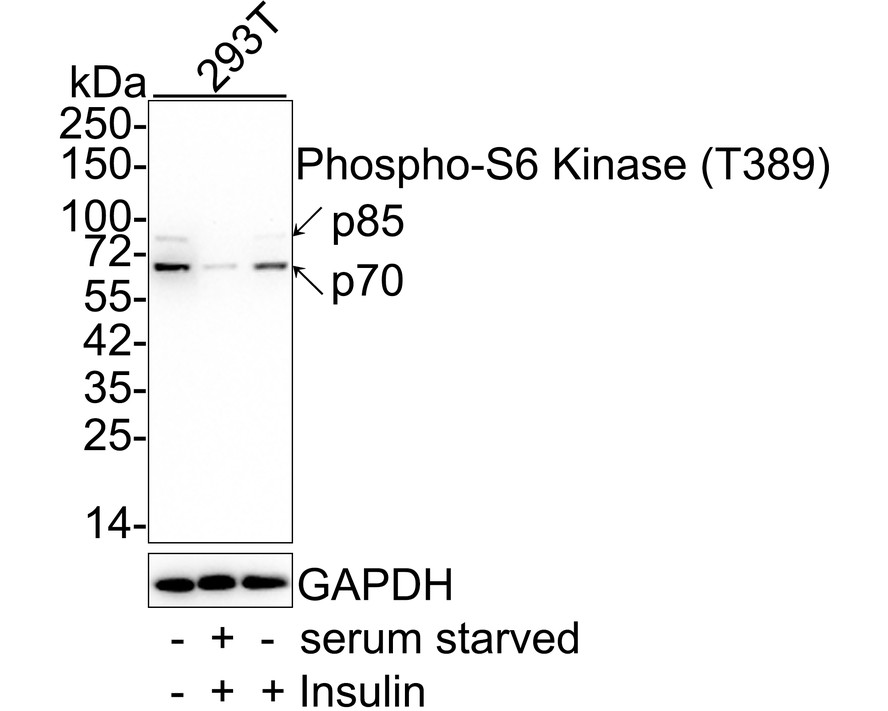 Western blot analysis of Phospho-p70 S6 Kinase (T389) on different lysates with Rabbit anti-Phospho-p70 S6 Kinase (T389) antibody (HA750791) at 1/1,000 dilution.