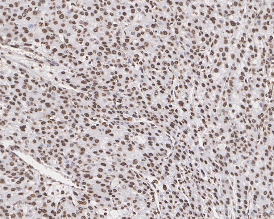 Immunohistochemical analysis of paraffin-embedded human liver carcinoma tissue with Rabbit anti-Phospho-p70 S6 Kinase (T389) antibody (HA750791) at 1/1,000 dilution.