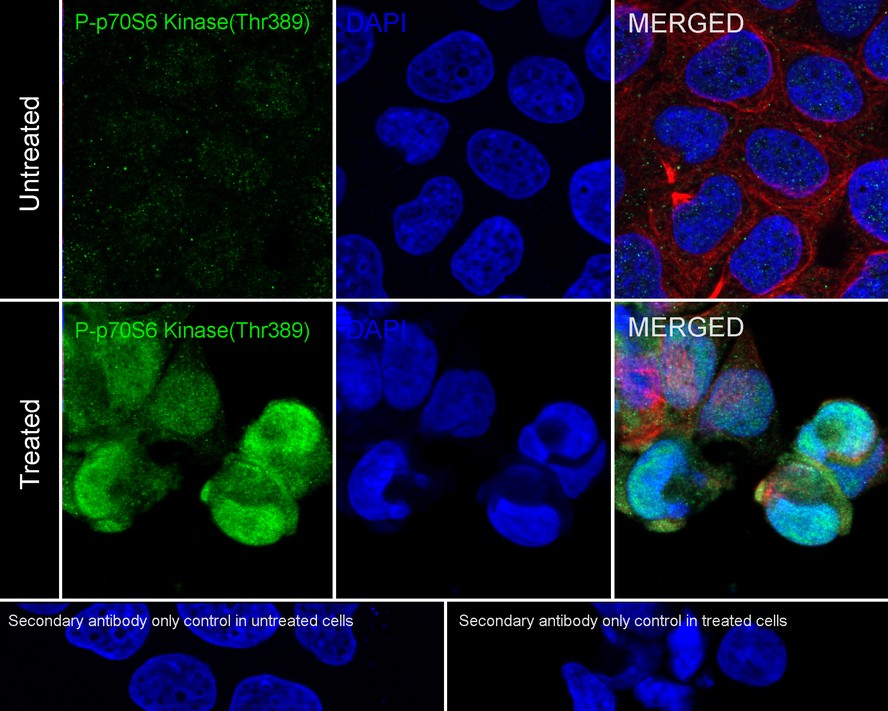 Cells were fixed in 4% paraformaldehyde for 20 minutes at room temperature, permeabilized with 0.1% Triton X-100 in PBS for 5 minutes at room temperature, then blocked with 1% BSA in 10% negative goat serum for 1 hour at room temperature. Cells were then incubated with Rabbit anti-Phospho-p70 S6 Kinase (T389) antibody (HA750791) at 1/100 dilution in 1% BSA in PBST overnight at 4 ℃. Goat Anti-Rabbit IgG H&L (iFluor™ 488, HA1121) was used as the secondary antibody at 1/1,000 dilution. PBS instead of the primary antibody was used as the secondary antibody only control. Nuclear DNA was labelled in blue with DAPI.