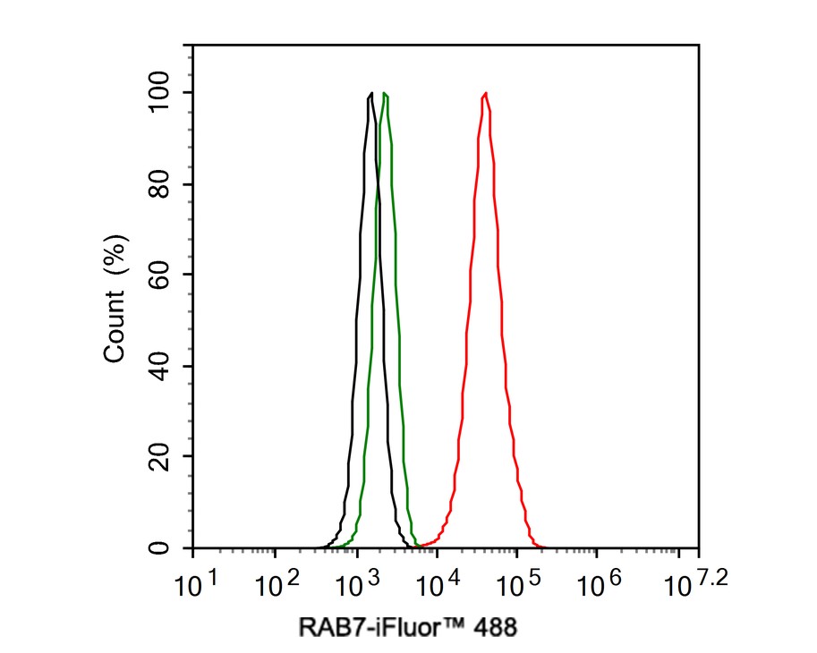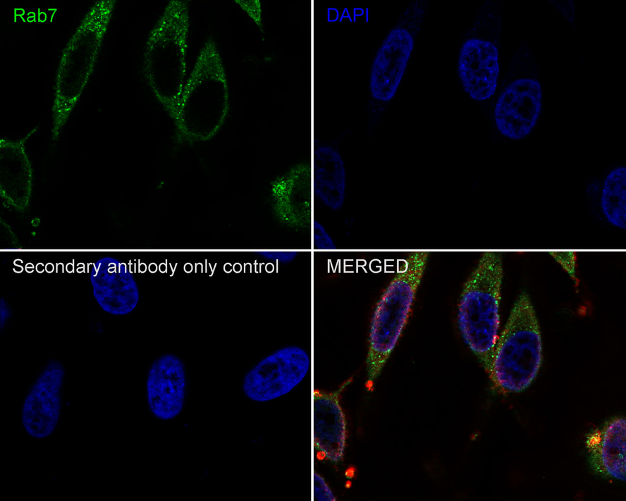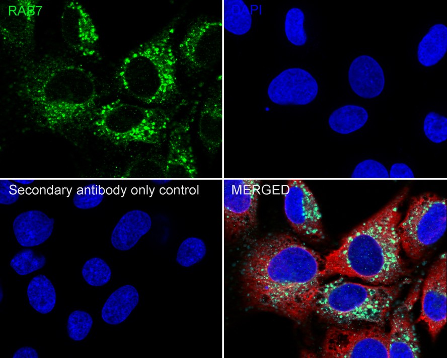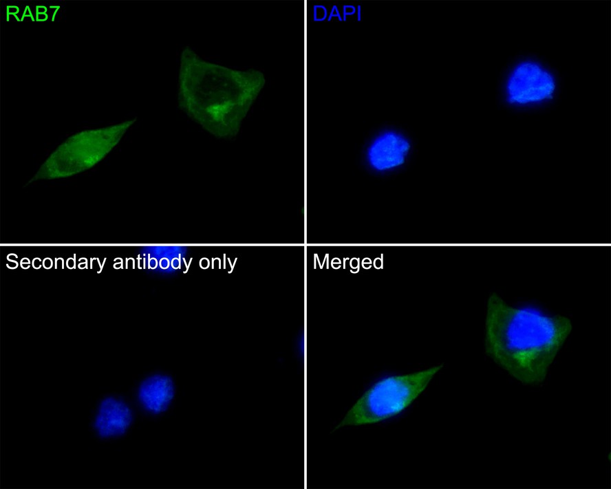 Cells were fixed in 4% paraformaldehyde for 20 minutes at room temperature, permeabilized with 0.1% Triton X-100 in PBS for 5 minutes at room temperature, then blocked with 1% BSA in 10% negative goat serum for 1 hour at room temperature. Cells were then incubated with Rabbit anti-RAB7 antibody (HA750279) at 1/1,000 dilution in 1% BSA in PBST overnight at 4 ℃. Goat Anti-Rabbit IgG H&L (iFluor™ 488, HA1121) was used as the secondary antibody at 1/1,000 dilution. PBS instead of the primary antibody was used as the secondary antibody only control. Nuclear DNA was labelled in blue with DAPI.