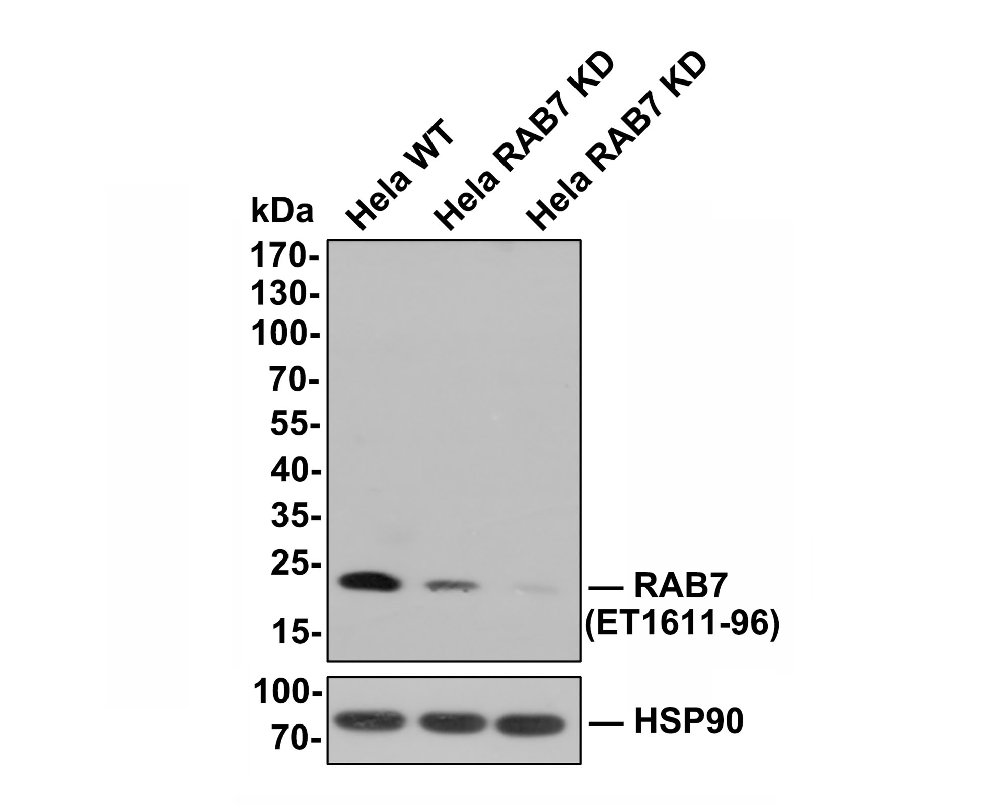 ET1611-96 was shown to specifically react with RAB7 in wild-type Hela cells. Weakened bands were observed when RAB7 knockdown samples were tested. Wild-type and RAB7 knockdown samples were subjected to SDS-PAGE. Proteins were transferred to a PVDF membrane and blocked with 5% NFDM in TBST for 1 hour at room temperature. The primary antibody (ET1611-96, 1:500) was used in 5% BSA at room temperature for 2 hours. Goat Anti-Rabbit IgG-HRP Secondary Antibody (HA1001) at 1:300,000 dilution was used for 1 hour at room temperature.