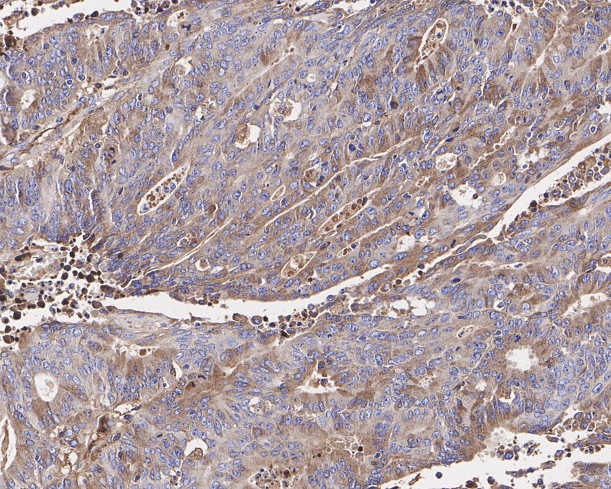 Immunohistochemical analysis of paraffin-embedded human colon carcinoma tissue with Rabbit anti-RAB7 antibody (HA750279) at 1/1,000 dilution.