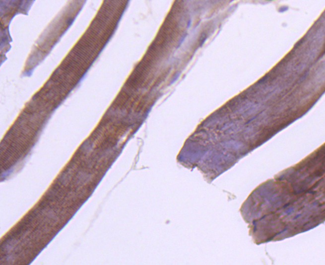 Immunohistochemical analysis of paraffin-embedded mouse skeletal tissue using anti-RAB7 antibody. The section was pre-treated using heat mediated antigen retrieval with Tris-EDTA buffer (pH 8.0-8.4) for 20 minutes.The tissues were blocked in 5% BSA for 30 minutes at room temperature, washed with ddH2O and PBS, and then probed with the primary antibody (HA750279, 1/50) for 30 minutes at room temperature. The detection was performed using an HRP conjugated compact polymer system. DAB was used as the chromogen. Tissues were counterstained with hematoxylin and mounted with DPX.