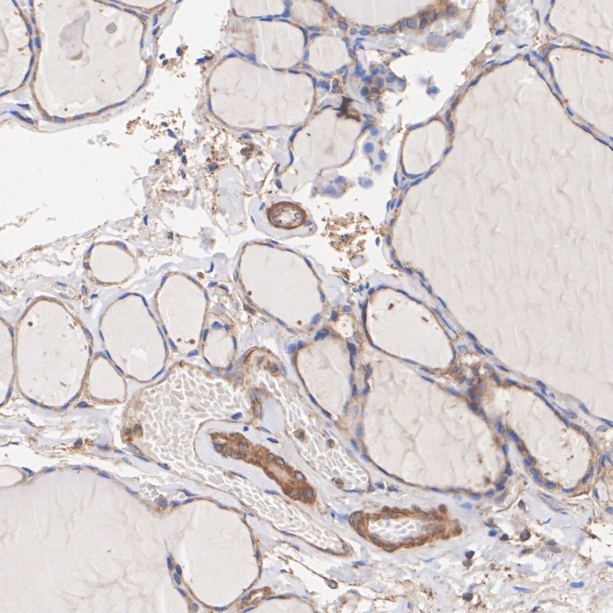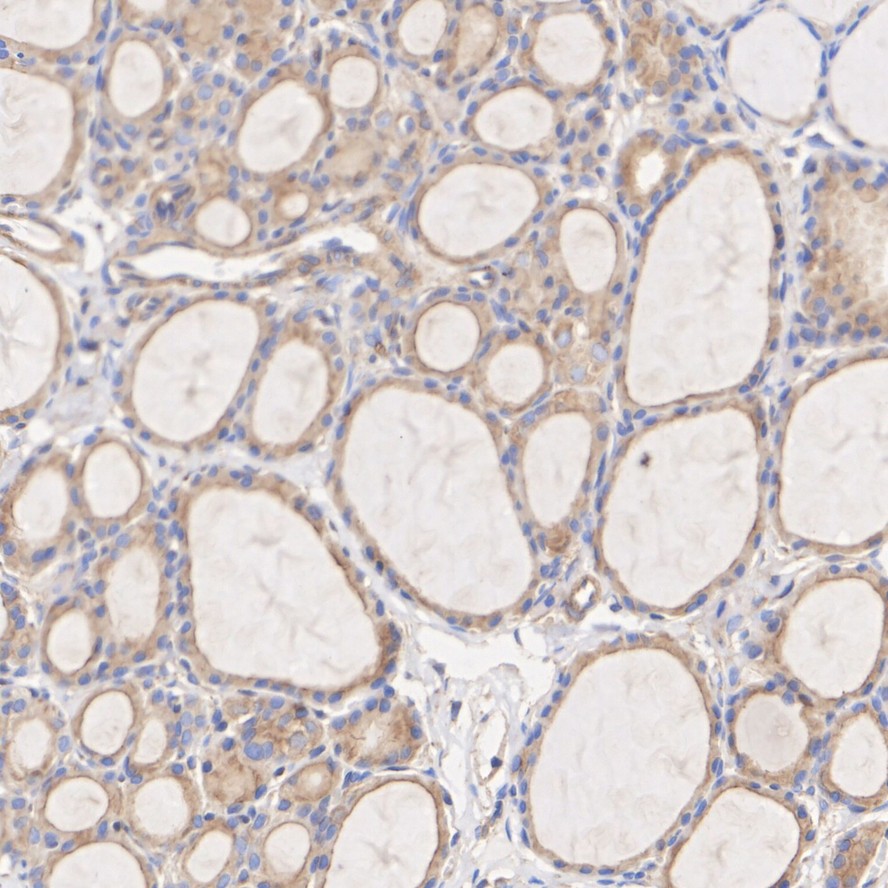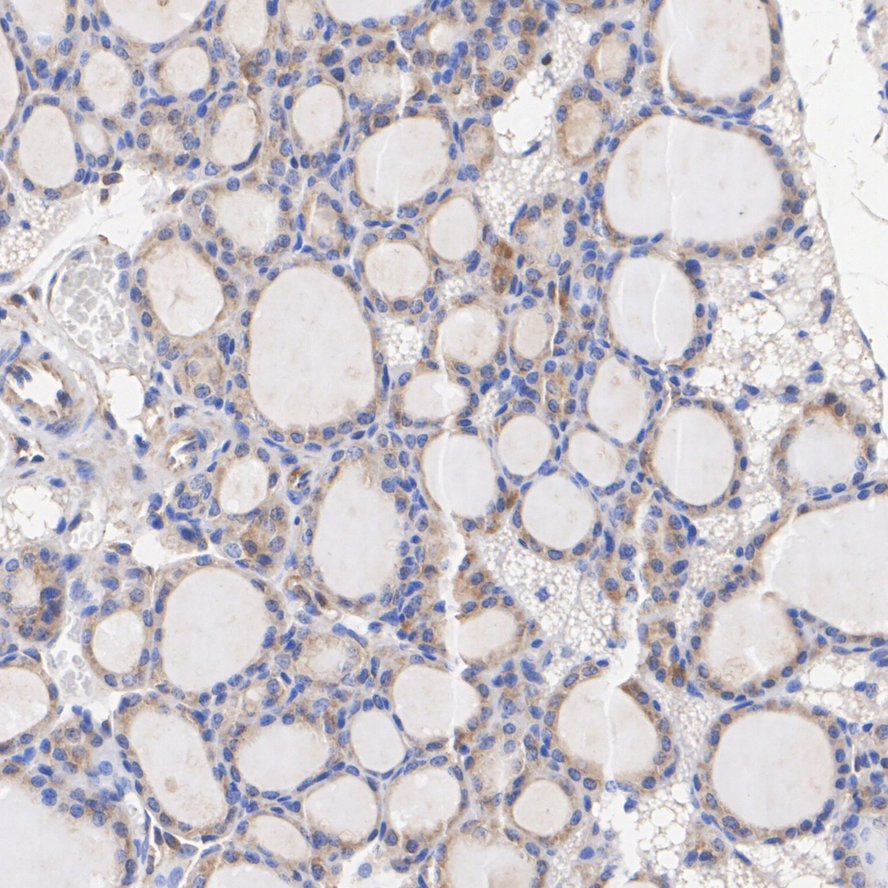 Immunohistochemical analysis of paraffin-embedded mouse thyroid tissue with Rabbit anti-ROCK1 antibody (ET1609-53) at 1/200 dilution.