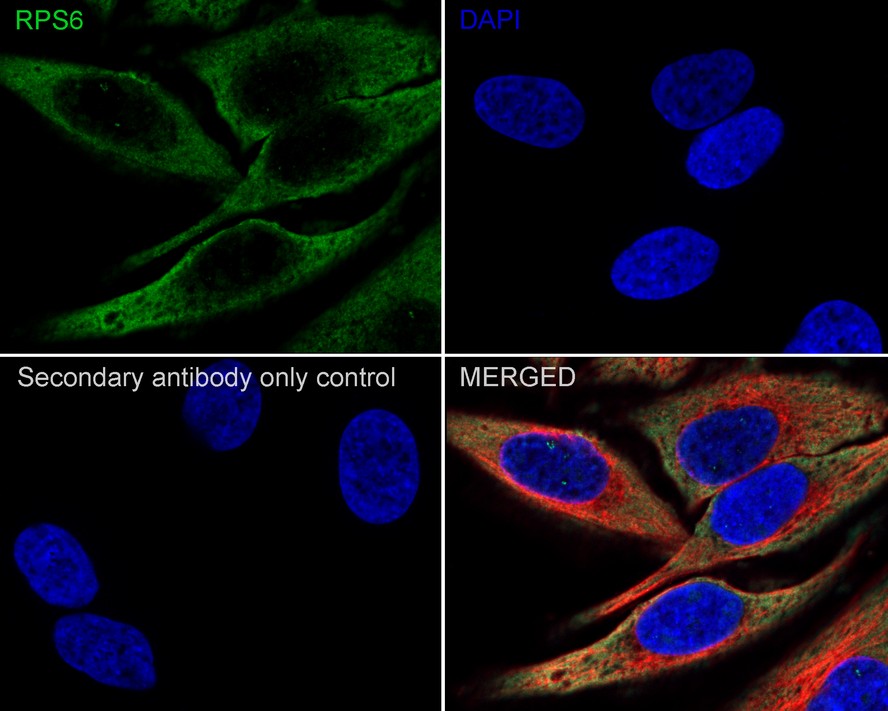 Cells were fixed in 4% paraformaldehyde for 20 minutes at room temperature, permeabilized with 0.1% Triton X-100 in PBS for 5 minutes at room temperature, then blocked with 1% BSA in 10% negative goat serum for 1 hour at room temperature. Cells were then incubated with Mouse anti-RPS6 antibody (HA610092) at 1/100 dilution in 1% BSA in PBST overnight at 4 ℃. Goat Anti-Mouse IgG H&L (iFluor™ 488, HA1125) was used as the secondary antibody at 1/1,000 dilution. PBS instead of the primary antibody was used as the secondary antibody only control. Nuclear DNA was labelled in blue with DAPI.
