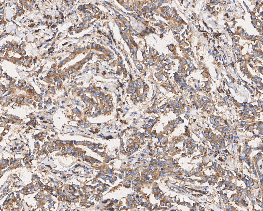 The section was pre-treated using heat mediated antigen retrieval with sodium citrate buffer (pH 6.0) (high pressure) for 2 minutes. The tissues were blocked in 1% BSA for 20 minutes at room temperature, washed with ddH2O and PBS, and then probed with the primary antibody (HA610092) at 1/2,000 dilution for 1 hour at room temperature. The detection was performed using an HRP conjugated compact polymer system. DAB was used as the chromogen. Tissues were counterstained with hematoxylin and mounted with DPX.