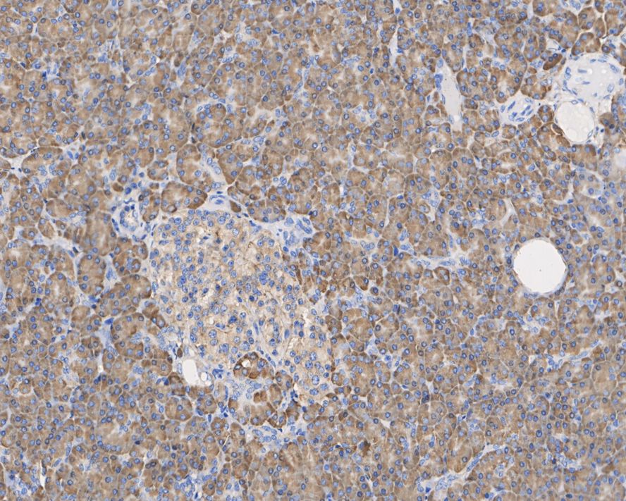 Immunohistochemical analysis of paraffin-embedded human pancreas tissue with Mouse anti-RPS6 antibody (HA610092) at 1/2,000 dilution.