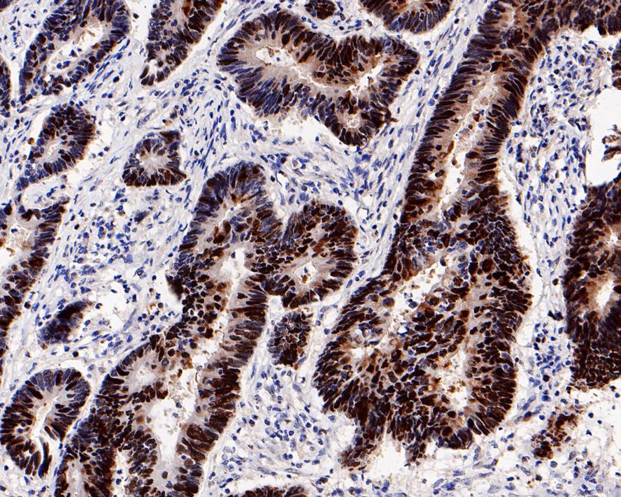 Immunohistochemical analysis of paraffin-embedded human colon carcinoma tissue with Rabbit anti-Rb antibody (HA750135) at 1/800 dilution.