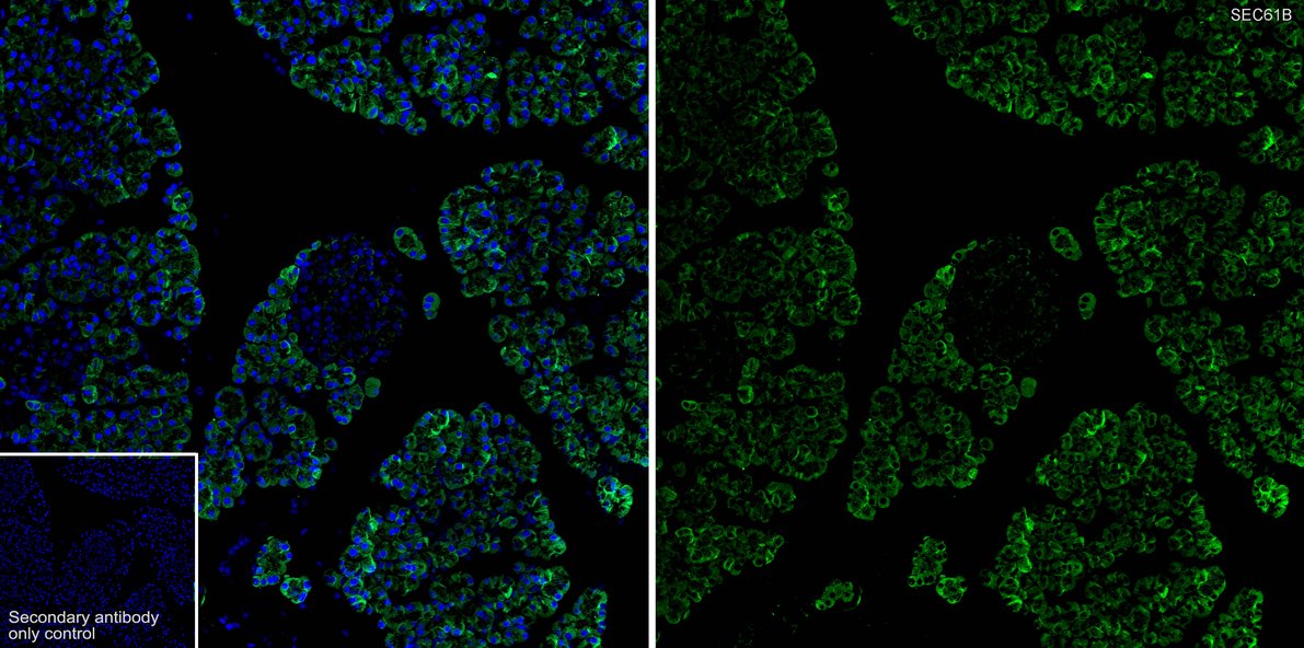 Cells were fixed in 4% paraformaldehyde for 15 minutes at room temperature, permeabilized with 0.1% Triton X-100 in PBS for 15 minutes at room temperature, then blocked with 1% BSA in 10% negative goat serum for 1 hour at room temperature. Cells were then incubated with Rabbit anti-SEC61B antibody (HA751295) at 1/100 dilution in 1% BSA in PBST overnight at 4 ℃. Goat Anti-Rabbit IgG H&L (iFluor™ 488, HA1121) was used as the secondary antibody at 1/1,000 dilution. PBS instead of the primary antibody was used as the secondary antibody only control. Nuclear DNA was labelled in blue with DAPI.