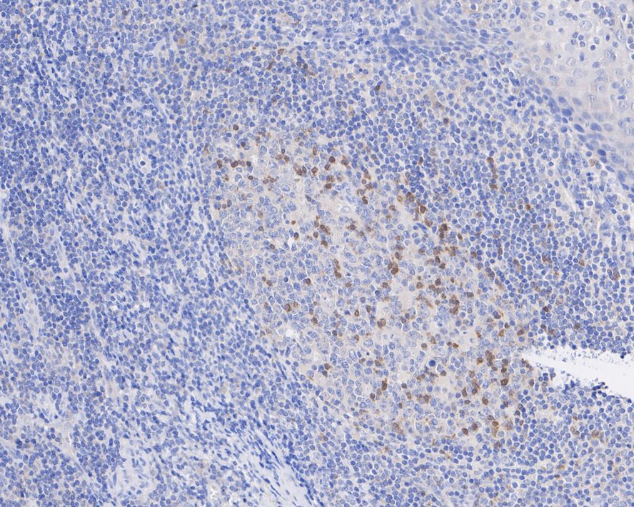 Immunohistochemical analysis of paraffin-embedded human tonsil tissue with Rabbit anti-SHP2 antibody (ET1611-80) at 1/500 dilution.