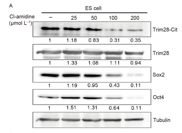 Trim28 citrullination maintains mouse embryonic stem cell pluripotency via regulating Nanog and Klf4 transcription