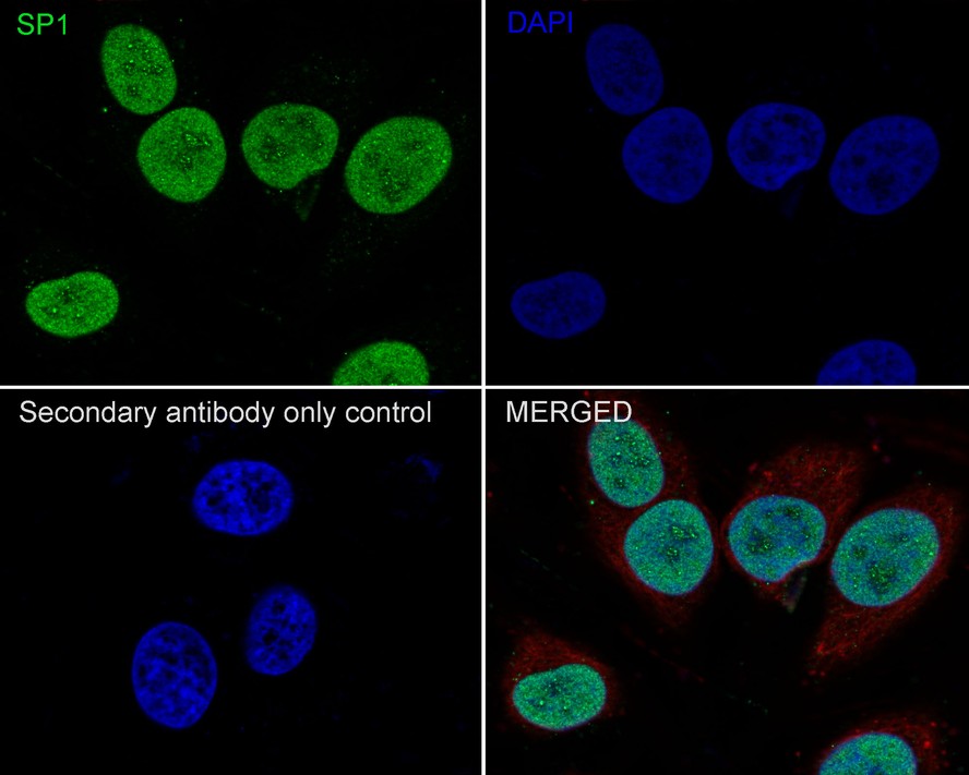 Cells were fixed in 4% paraformaldehyde for 10 minutes at 37 ℃, permeabilized with 0.05% Triton X-100 in PBS for 20 minutes, and then blocked with 2% negative goat serum for 30 minutes at room temperature. Cells were then incubated with Rabbit anti-SP1 antibody (HA750330) at 1/200 dilution in 2% negative goat serum overnight at 4 ℃. Goat Anti-Rabbit IgG H&L (iFluor™ 488, HA1121) was used as the secondary antibody at 1/1,000 dilution. Nuclear DNA was labelled in blue with DAPI.