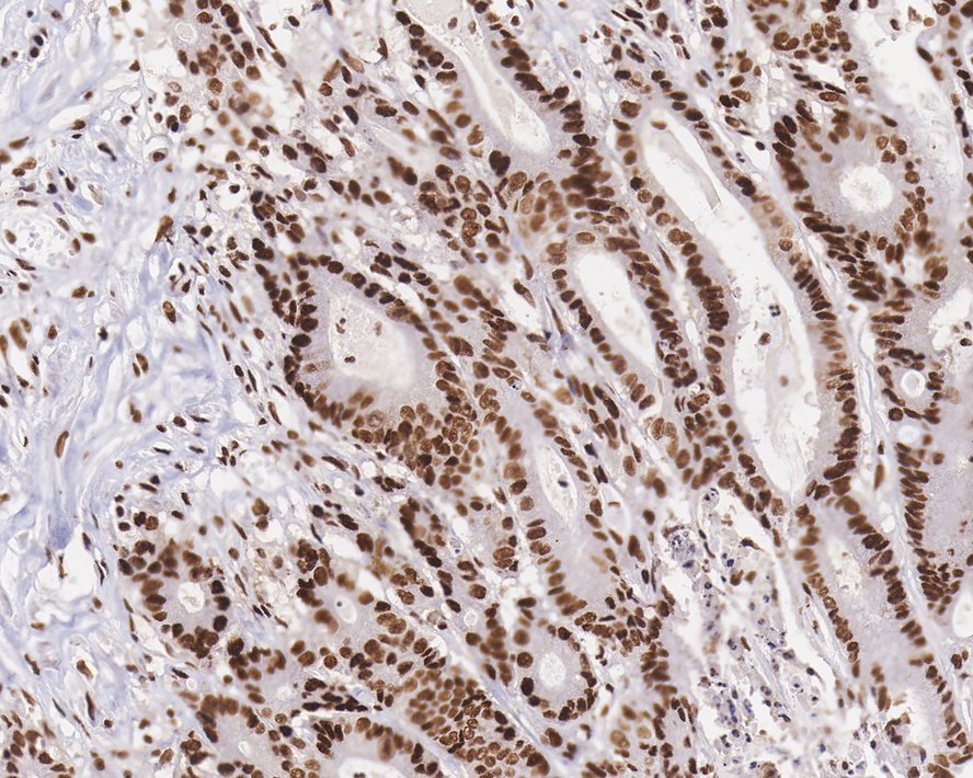 Immunohistochemical analysis of paraffin-embedded human colon cancer tissue with Rabbit anti-SP1 antibody (HA750330) at 1/1,000 dilution.